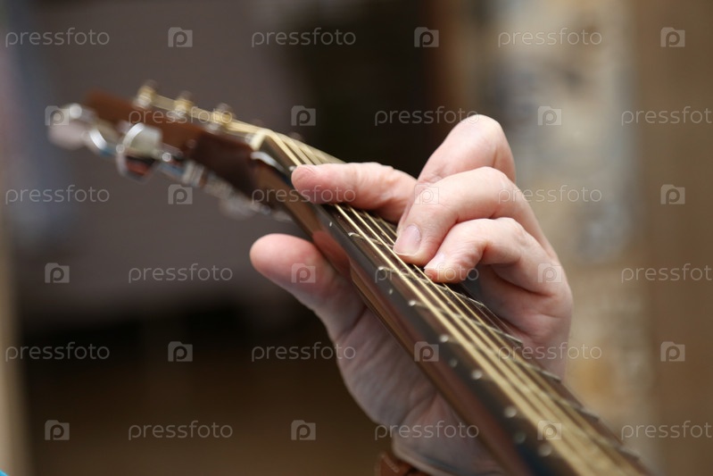 Игра на гитаре. Руки гитариста крупным планом и классическая шестиструнная гитара