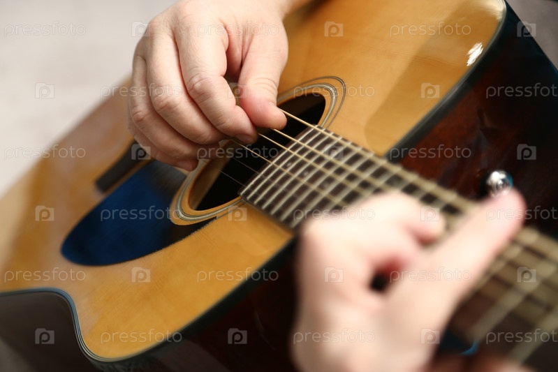 Игра на гитаре. Руки гитариста крупным планом и классическая шестиструнная гитара