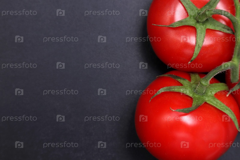Красные спелые помидоры на ветке. Овощи на черном текстурированном фоне