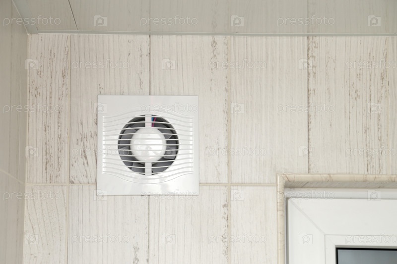 Белый вентилятор на стене в ванной. Тесная маленькая ванная комната