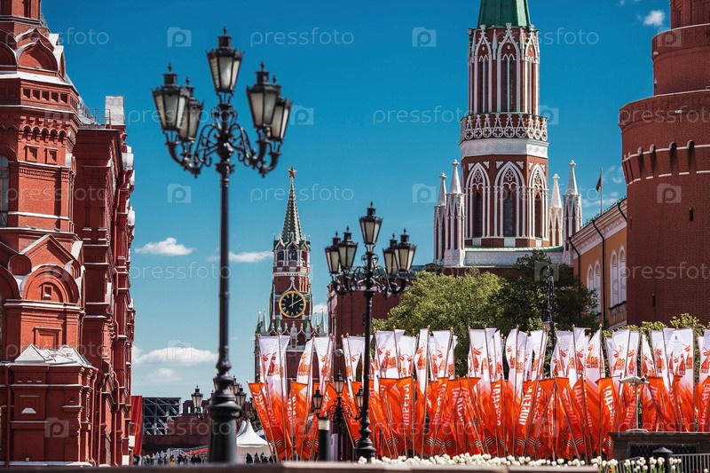 Россия, Москва, 28 апреля 2025 г. Подготовка к празднованию 80-летия Победы в Великой Отечественной войне. Праздничные флаги на фоне Кремля