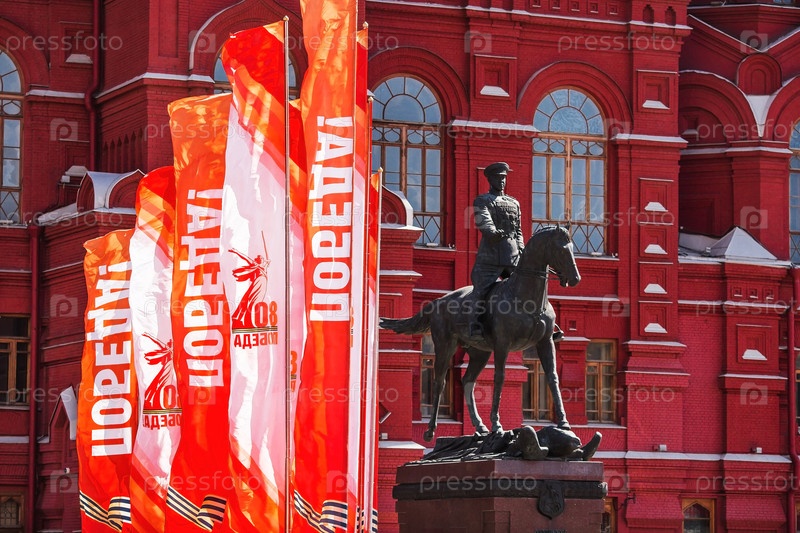 Россия, Москва, 28 апреля 2025 года. Подготовка к празднованию 80-летия Победы в Великой Отечественной войне. Праздничные флаги на фоне маршала Жукова