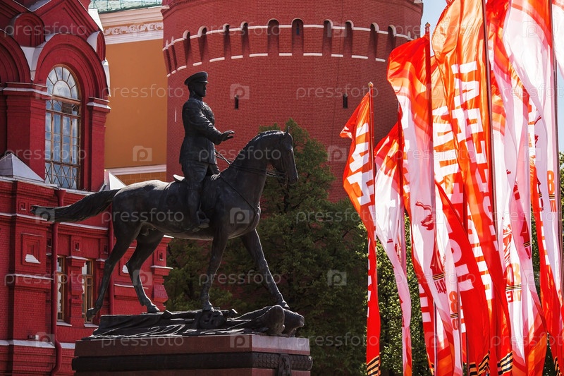 Россия, Москва, 28 апреля 2025 года. Подготовка к празднованию 80-летия Победы в Великой Отечественной войне. Праздничные флаги на фоне маршала Жукова