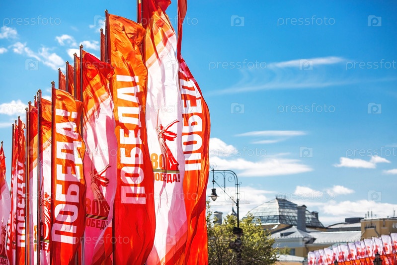 Россия, Москва, 28 апреля 2025 года. Подготовка к празднованию 80-летия Победы в Великой Отечественной войне. Праздничные флаги в центре Москвы