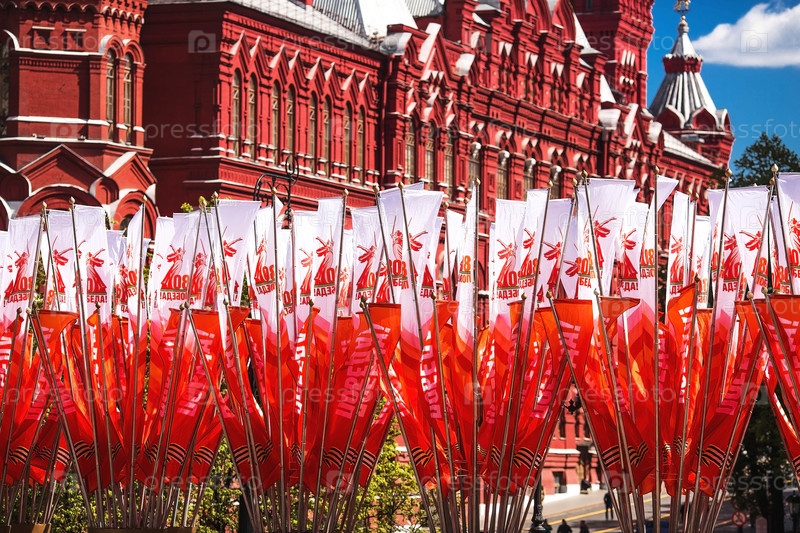 Россия, Москва, 28 апреля 2025 года. Подготовка к празднованию 80-летия Победы в Великой Отечественной войне. Праздничные флаги в центре Москвы