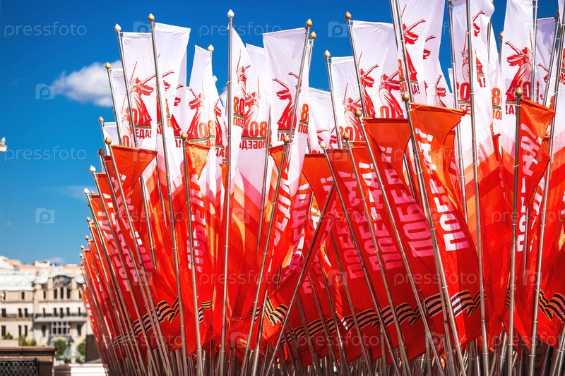 Россия, Москва, 28 апреля 2025 года. Подготовка к празднованию 80-летия Победы в Великой Отечественной войне. Праздничные флаги в центре Москвы