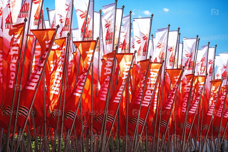 Россия, Москва, 28 апреля 2025 года. Подготовка к празднованию 80-летия Победы в Великой Отечественной войне. Праздничные флаги в центре Москвы