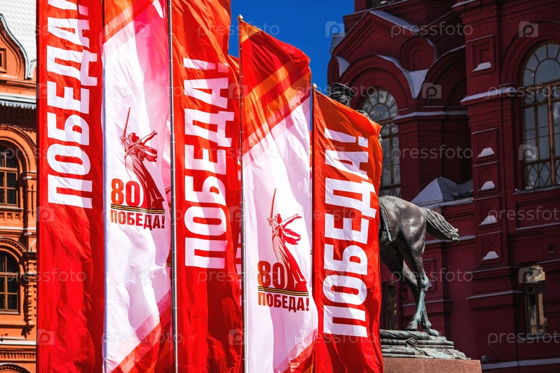 Россия, Москва, 28 апреля 2025 года. Подготовка к празднованию 80-летия Победы в Великой Отечественной войне. Праздничные флаги на фоне маршала Жукова