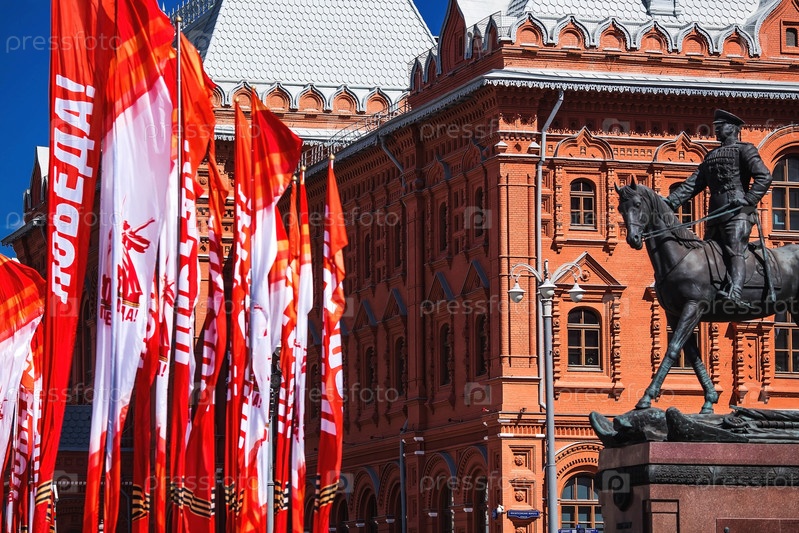 Россия, Москва, 28 апреля 2025 года. Подготовка к празднованию 80-летия Победы в Великой Отечественной войне. Праздничные флаги на фоне маршала Жукова