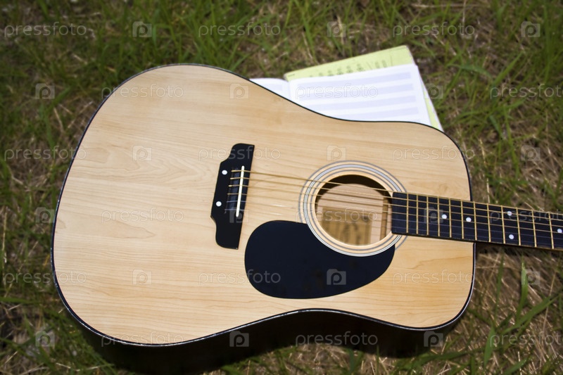 Гитара и нотная тетрадь на лужайке