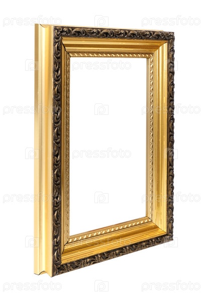 Золотая рамка в перспективе для картин, зеркал или фото, изолированная на белом фоне. Элемент дизайна с обтравочным контуром