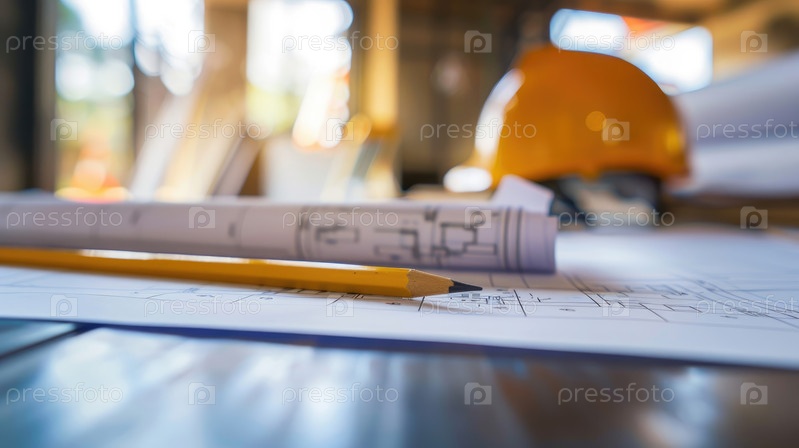 Архитектурное рабочее место с чертежами, карандашами и защитной каской при дневном свете