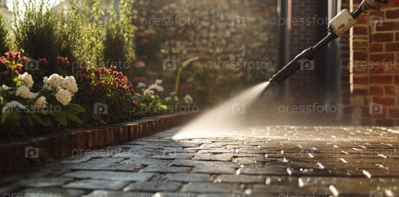 Легкая струя из садового шланга освежает яркие цветы и брусчатку под теплыми лучами утреннего солнца