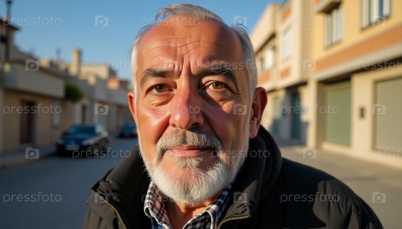 Пожилой мужчина с добрым выражением лица и ухоженной бородой уверенно стоит на залитой солнцем улице в Газе. За его спиной фасады причудливых зданий добавляют очарования сцене