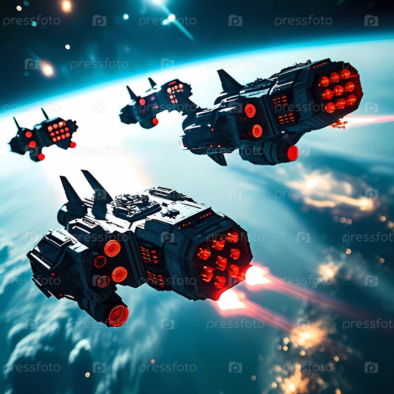 Множество изящных космических кораблей мчатся сквозь космос, их двигатели ярко светятся, пока они решительно и целеустремленно перемещаются по темной, усеянной звездами вселенной. Генеративный ИИ