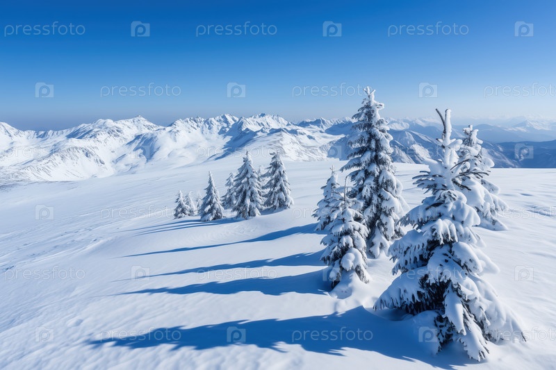 Красивый зимний пейзаж с заснеженными елями и голубым небом