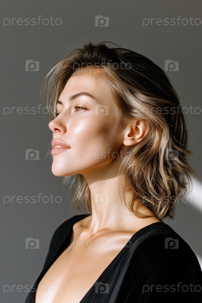 Портрет красивой молодой женщины в черном платье на сером фоне