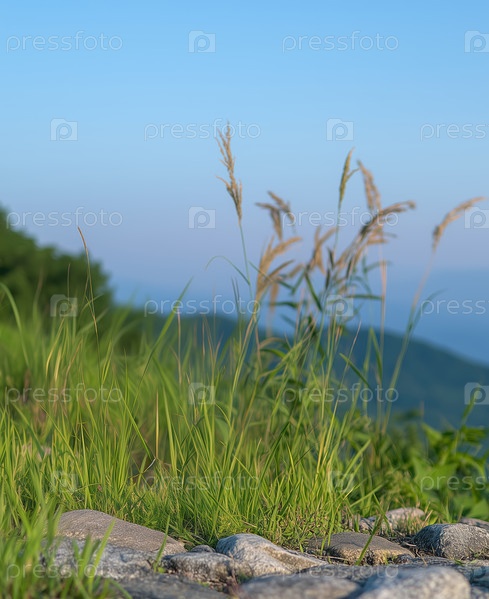 Трава на скале на фоне голубого неба и гор утром