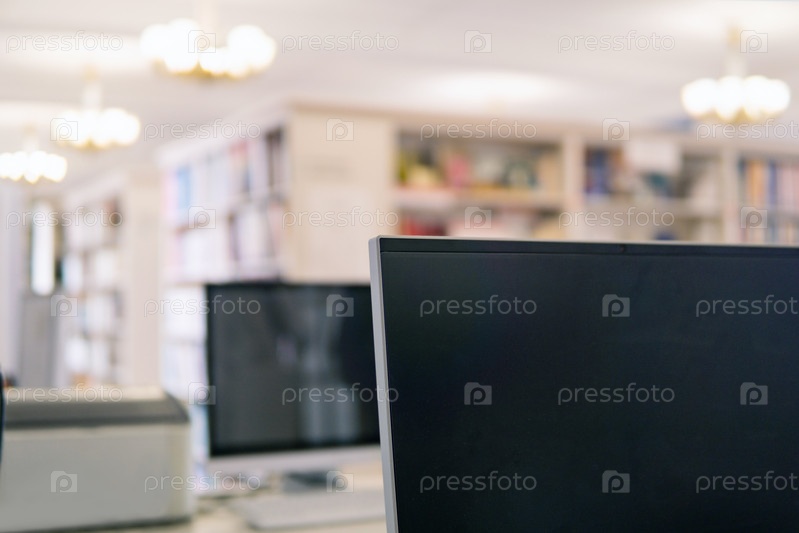 Размытый фон традиционной библиотеки с монитором компьютера на переднем плане и книжными полками