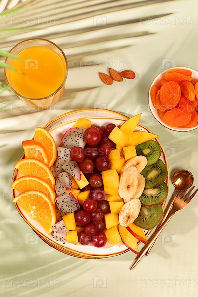 Фруктовый салат из фрукта дракона, манго, киви, апельсина, орехов, кураги и апельсинового сока, экзотические фрукты для здорового образа жизни, продукты для детокс-диеты и похудения, рекламный баннер для кафе, ресторана