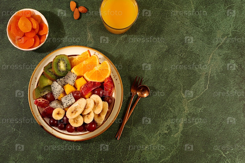 Фруктовый салат с киви, манго, драконий фрукт, виноград, орехи, цитрусовые с семенами чиа для похудения. Концепция натурального питания и детокс-диеты, Здоровый завтрак с ингредиентами, кухонный фон. образ жизни,