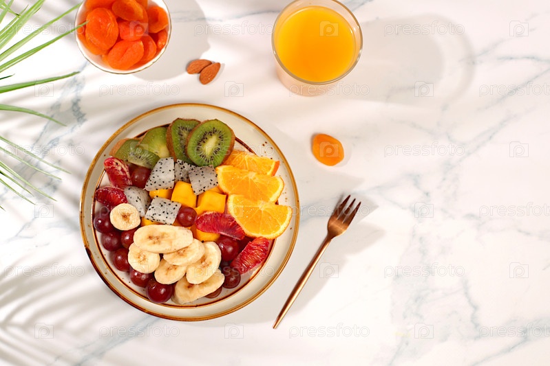 Фруктовый салат с киви, манго, драконий фрукт, виноград, орехи, цитрусовые с семенами чиа для похудения и сока. Концепция натурального питания и детокс-диеты, Здоровый завтрак с ингредиентами, кухонный фон. образ жизни,