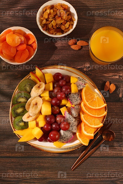 Фруктовый салат с киви, манго, драконий фрукт, виноград, орехи, цитрусовые с семенами чиа для похудения и сока. Концепция натурального питания и детокс-диеты, Здоровый завтрак с ингредиентами, кухонный фон. образ жизни,