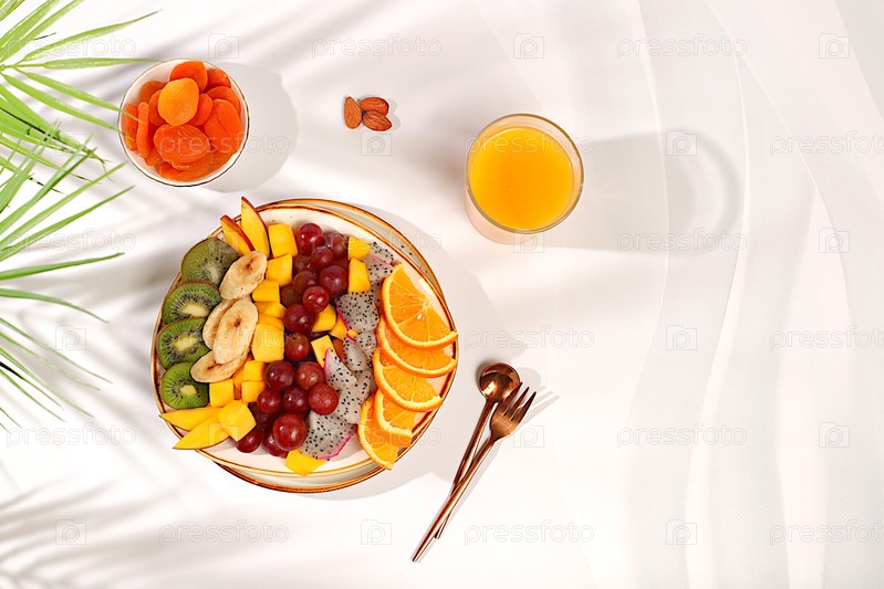 Фруктовый салат с киви, манго, драконий фрукт, виноград, орехи, цитрусовые с семенами чиа для похудения и стакан апельсинового сока. Концепция натурального питания и детокс-диеты, Здоровый завтрак с ингредиентами,