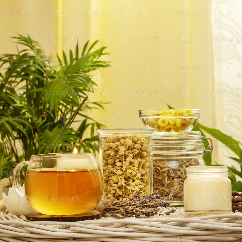 Домашний травяной чай из диких растений и цветов. Концепция домашней травяной аптеки. Концепция исцеления и ухода за собой с натуральными сухими цветами и травами, чашкой чая и свечами в домашнем интерьере с растениями