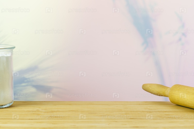 Пустой деревянный кухонный стол с раскатывателем теста и стаканом муки