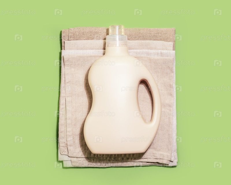 Макет натурального моющего средства для стирки. Бутылка с гелем для стирки или кондиционером для белья на текстильных салфетках на зеленом фоне. День стирки. Плоская планировка