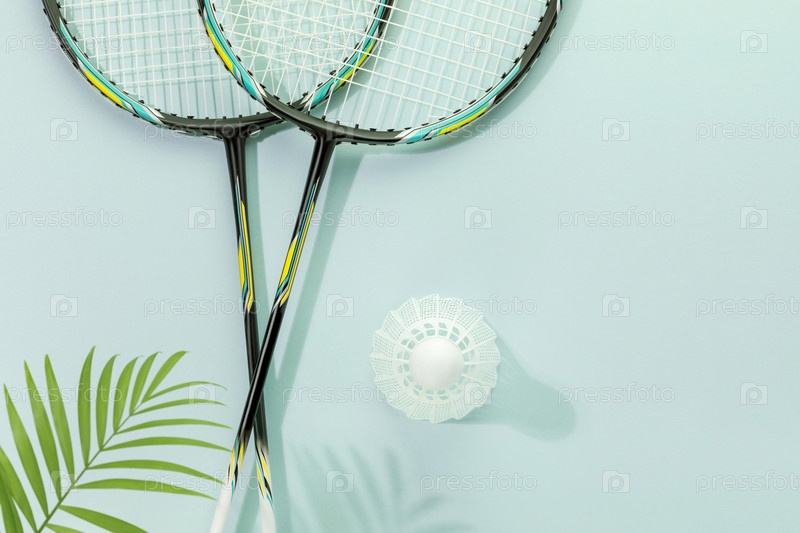 Бадминтонные ракетки и волан на синем фоне с пальмовым листом и тенями
