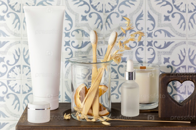 Экологичный натюрморт для ванны с био-зубной пастой, деревянными зубными щетками в стеклянной банке, органической сывороткой и косметическими средствами на деревянной полке в ванной. Концепция натуральной гигиены. Макет зубной пасты
