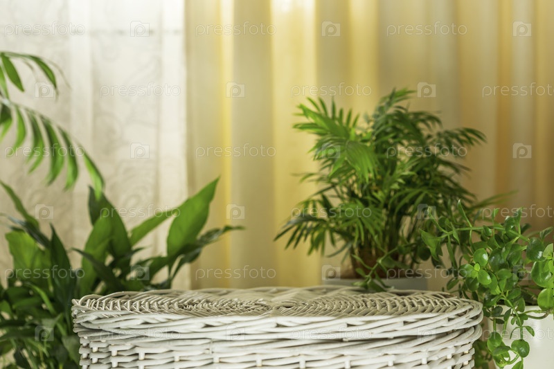 Часть интерьера дома с пустым подиумом на бежевом фоне с зелеными листьями