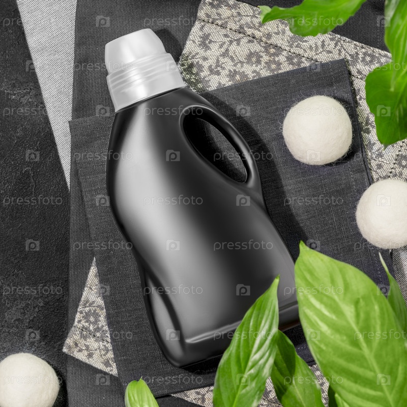 Макет натурального моющего средства для стирки черной одежды. Концепция моющего средства с бутылкой геля для стирки или кондиционера для белья на текстильных салфетках на черном фоне с растениями. День стирки