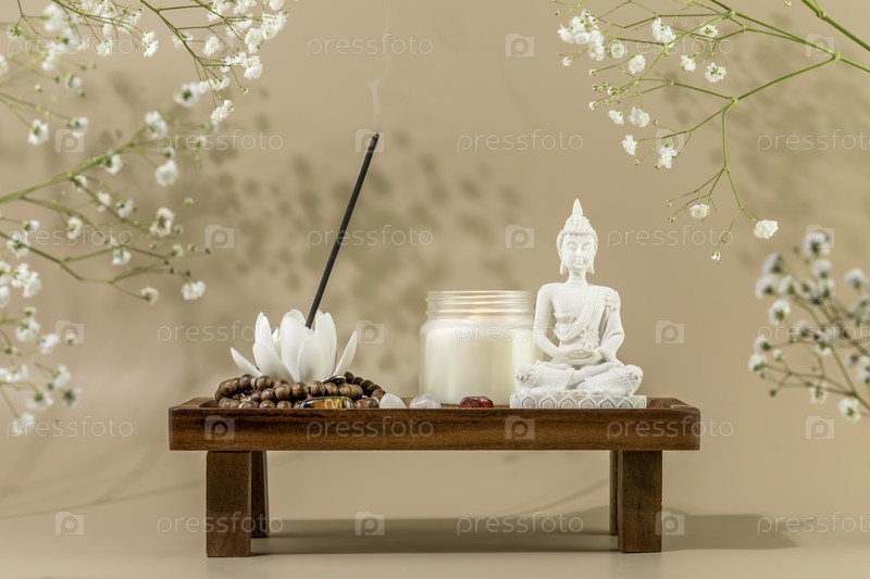 Статуя Будды, свеча, ароматическая палочка на деревянном подиуме с белыми цветами
