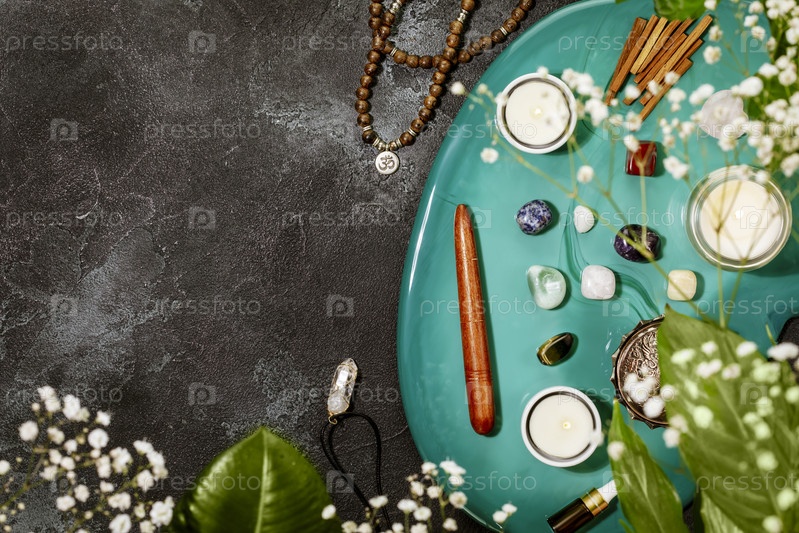 Уход за собой, целебная композиция с четками, ароматическими палочками, камнями чакры, палочками сандалового дерева и свечой на зеленом мраморном подиуме. Концепция расслабления, энергетического исцеления, медитации, времени для себя. Копировать пространс