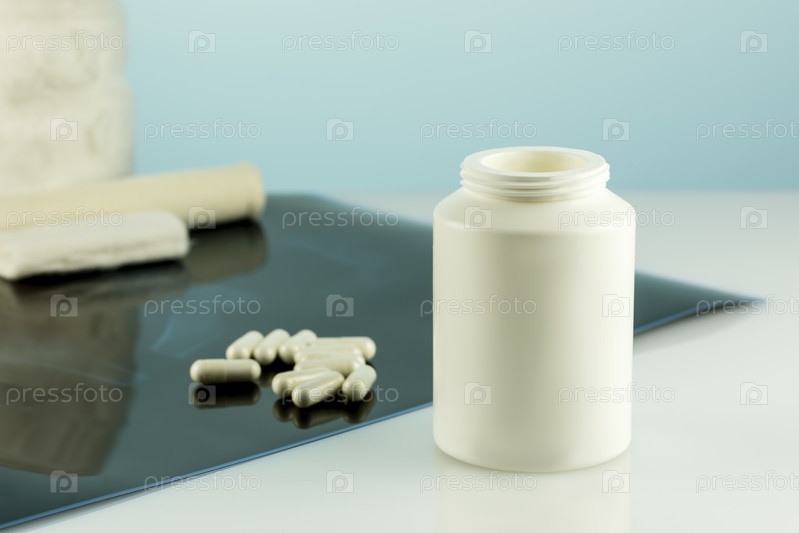 Кальций Ca добавки для здоровья костей человека. Здоровье костей и суставов. Белая бутылка с капсулами и рентгеновской пленкой на столе врача. Макет добавок для кожи, костей и суставов
