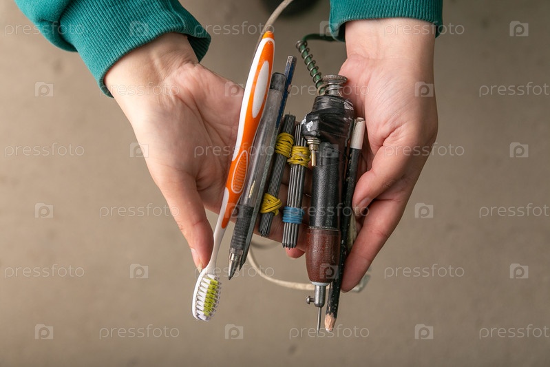 Мастер держит в руках инструменты для художественной ручной гравировки по камню
