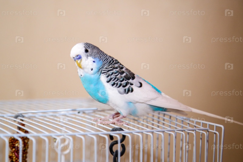А budgerigar is sitting on a cage