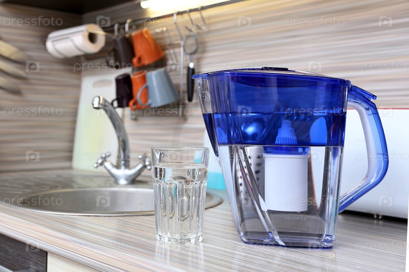 Стакан чистой воды и фильтр для очистки питьевой воды на столе в кухне. Очистка питьевой воды в домашних условиях
