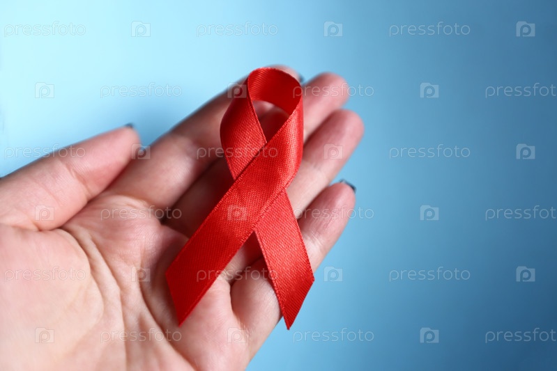 Красная лента как символ осведомленности о СПИДе в руке на синем фоне