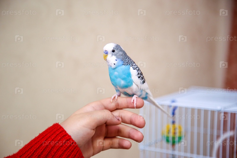 Волнистый попугайчик сидит на руке у девочки