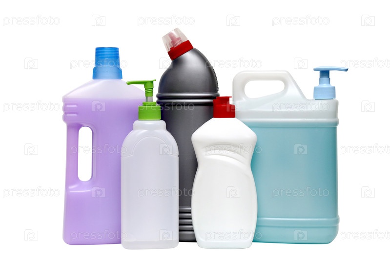 Бытовая химия для уборки дома. Моющие средства в пластиковых контейнерах и бутылках, изолированные на белом фоне