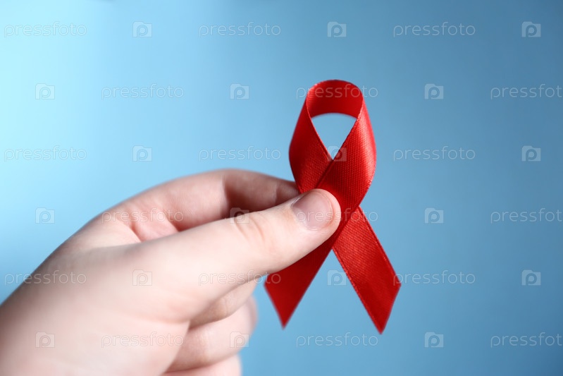 Красная лента как символ осведомленности о СПИДе в руке на синем фоне