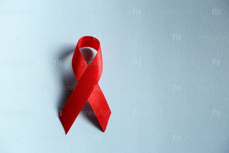 Красная лента как символ осведомленности о СПИДе на синем фоне