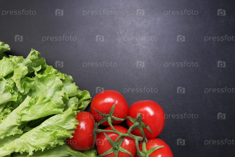 Зеленый салат листья красные спелые помидоры на ветке. Овощи на черном текстурированном фоне