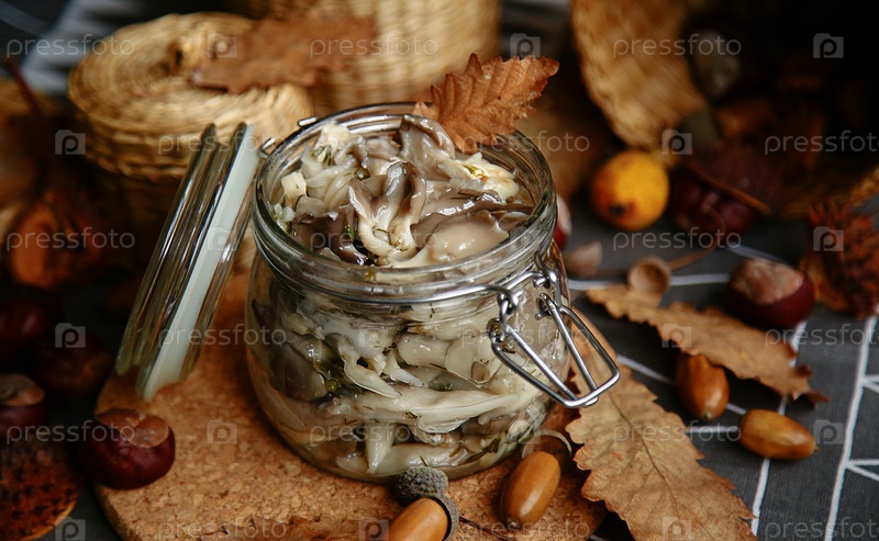 Маринованные грибы с маслом в стеклянной банке. Заготовка продуктов на зиму