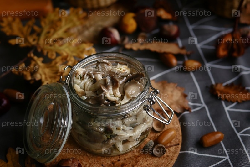 Маринованные грибы с маслом в стеклянной банке. Заготовка продуктов на зиму