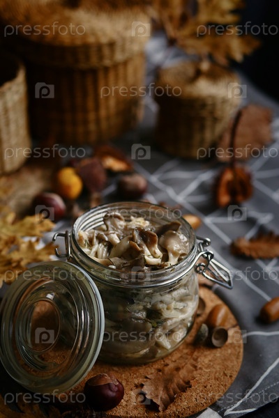 Маринованные грибы с маслом в стеклянной банке. Заготовка продуктов на зиму